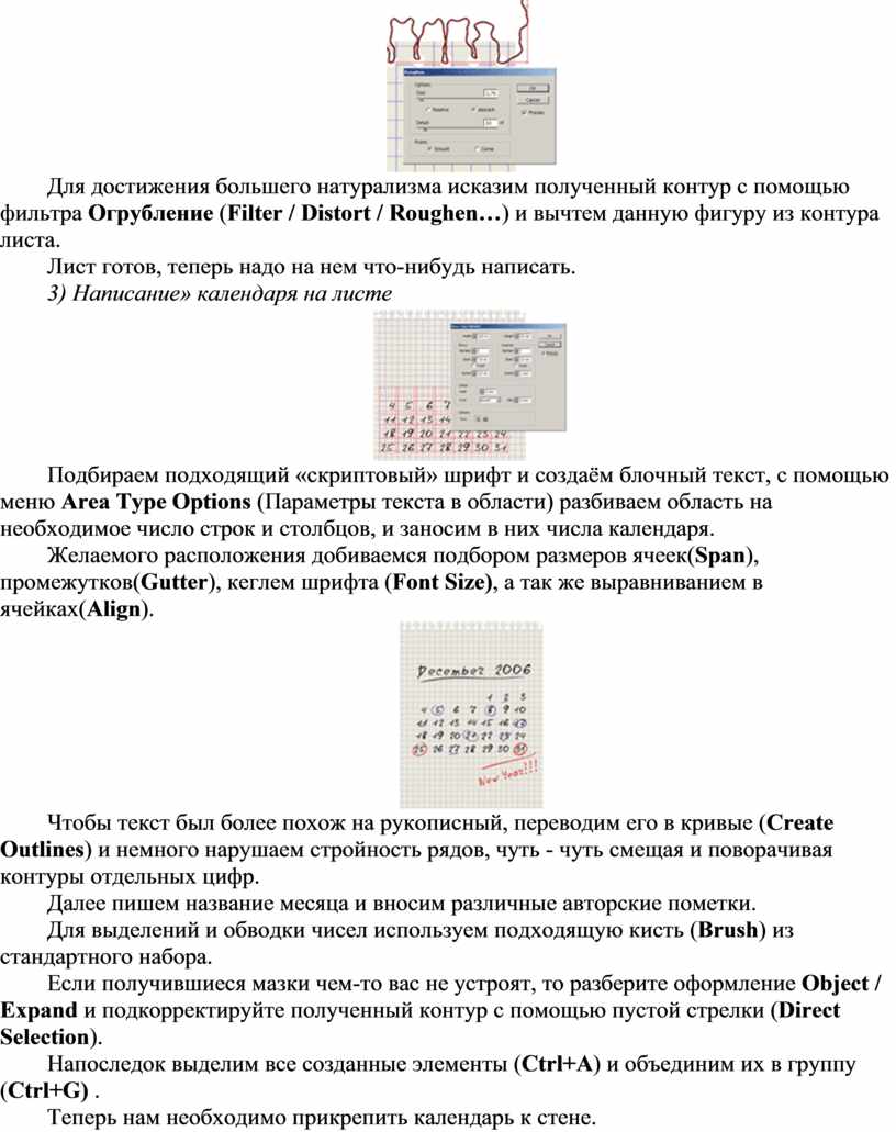 Подбираем подходящий «скриптовый» шрифт и создаём блочный текст, с помощью меню Area Type Options (Параметры текста в области) разбиваем область на необходимое число строк и столбцов, и заносим в них числа календаря.