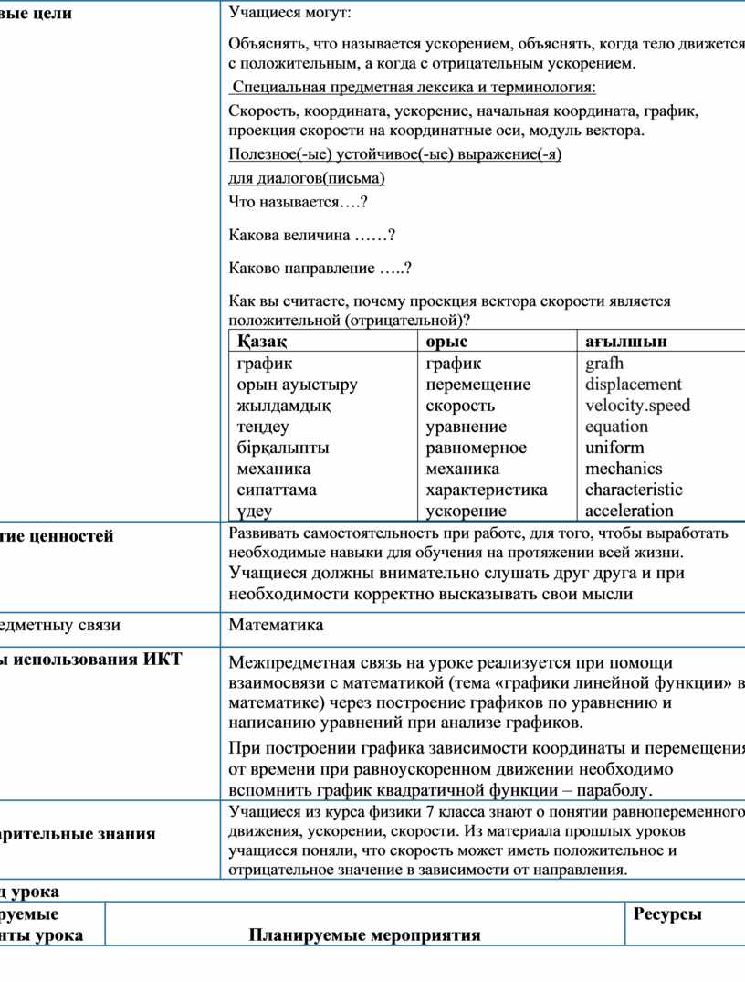 Учащиеся могут: Объяснять, что называется ускорением, объяснять, когда тело движется с положительным, а когда с отрицательным ускорением. Специальная предметная лексика и терминология: Скорость, координата, ускорение, начальная координата, график, проекция скорости на координатные оси, модуль вектора. Полезное(-ые) устойчивое(-ые) выражение(-я) для диалогов(письма) Что называется….? Какова величина ……? Каково направление …..? Как вы считаете, почему проекция вектора скорости является положительной (отрицательной)?
