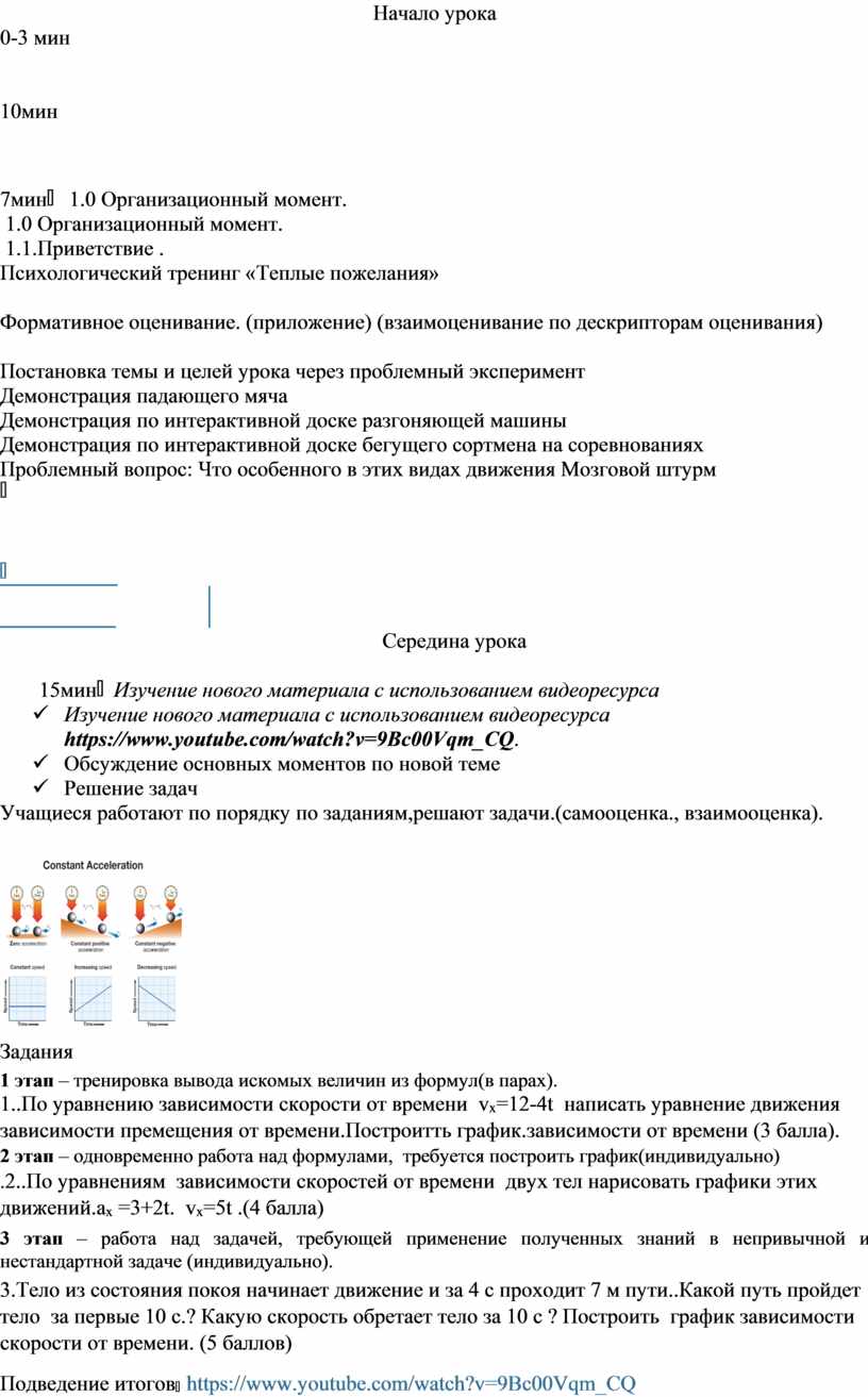 Учащиеся из курса физики 7 класса знают о понятии равнопеременного движения, ускорении, скорости. Из материала прошлых уроков учащиеся поняли, что скорость может иметь положительное и отрицательное значение в зависимости от направления. |