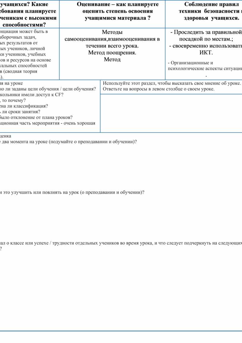 Рефлексия на урокеПравильно ли заданы цели обучения / цели обучения? Все ли школьники имели доступ к CF?Если нет, то почему?Исправлена ли классификация?Остались ли сроки занятия?Почему было отклонение от плана уроков?Организационная часть мероприятия - очень хорошая часть |