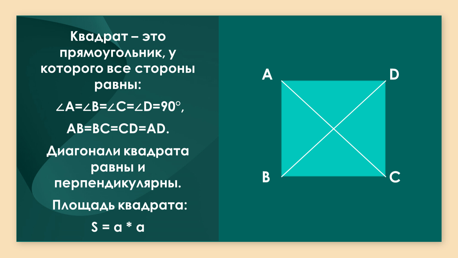 Диагонали квадрата равны и перпендикулярны.