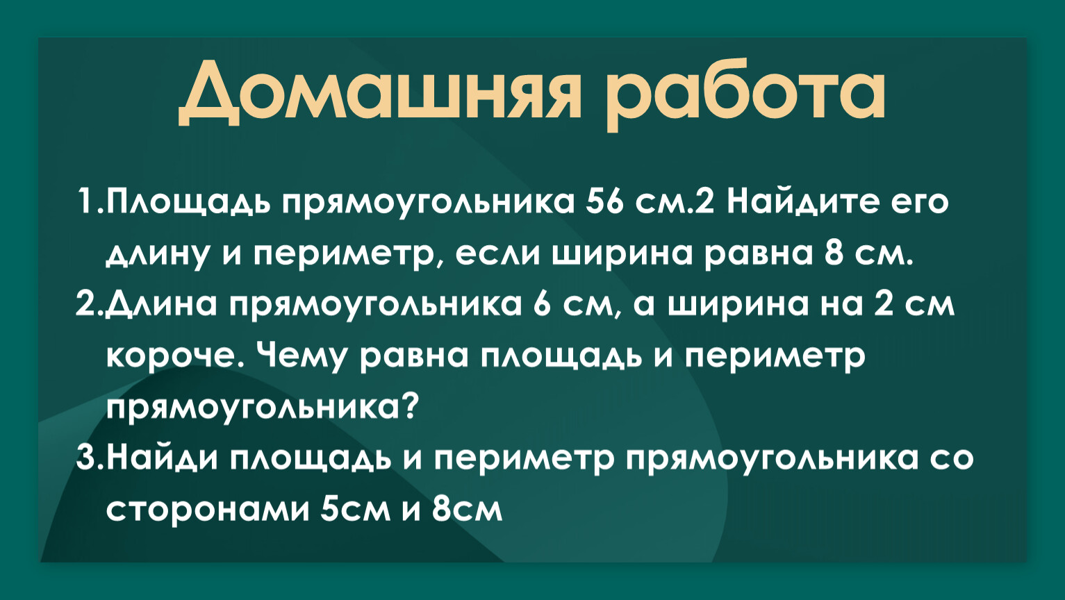 Ширина прямоугольника 3 см, а длина на 2 см больше. Чему равна площадь и периметр прямоугольника?