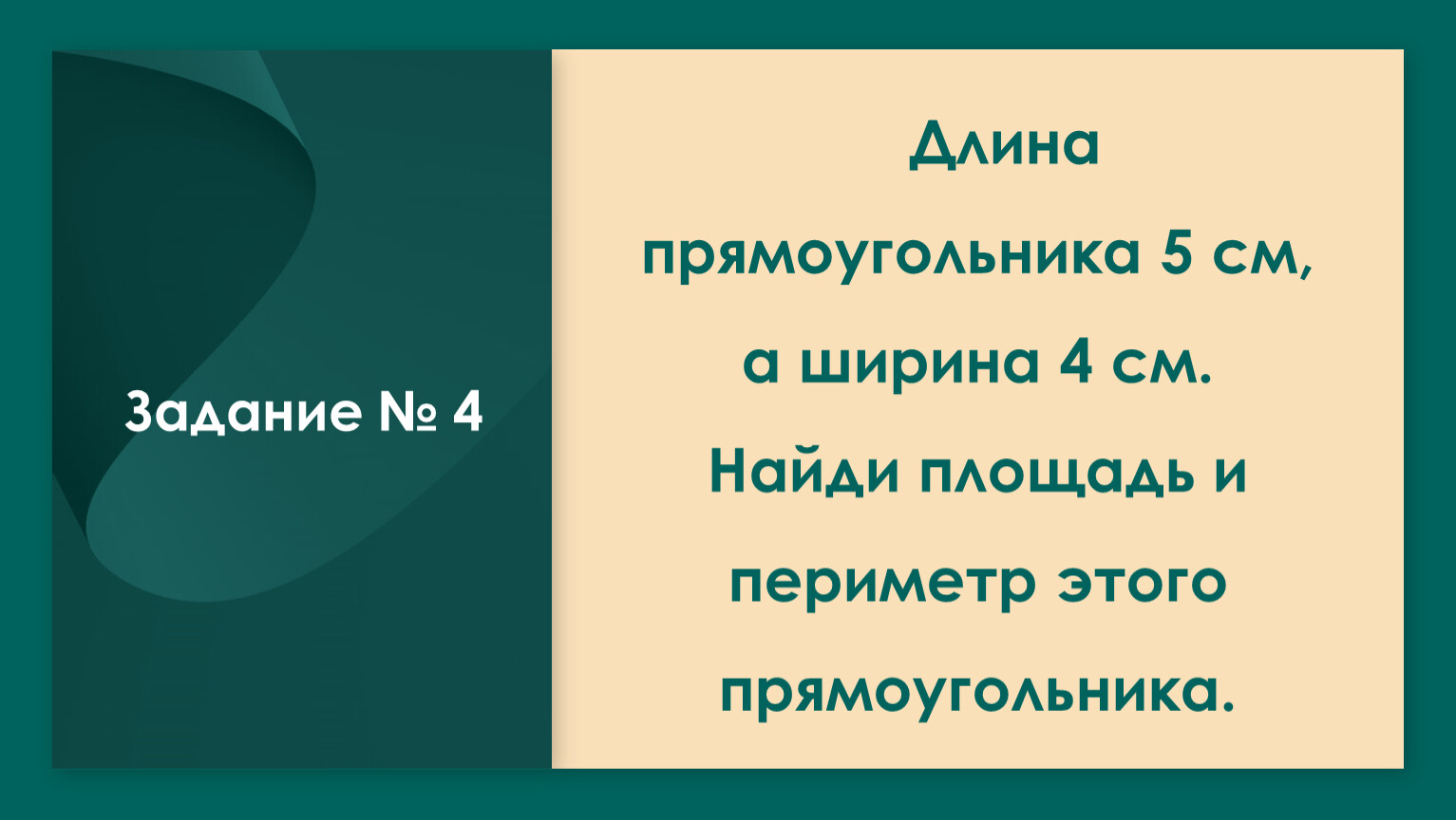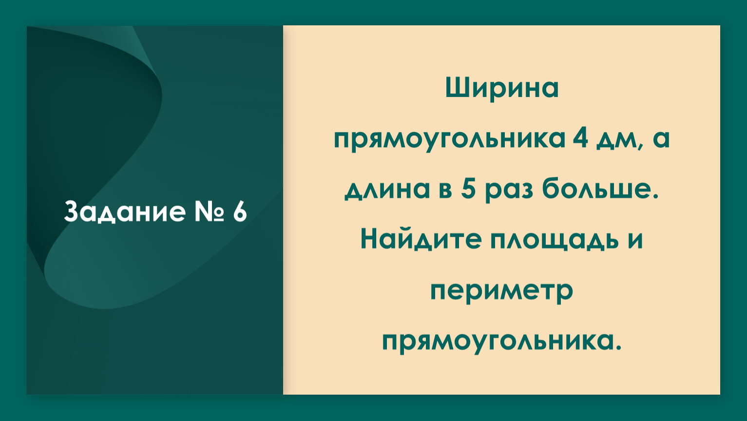 Ширина прямоугольника 4 дм, а длина в 5 раз больше. Найдите площадь и периметр прямоугольника.