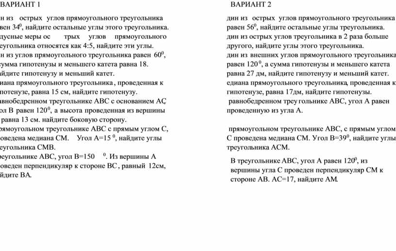 1. Один из острых углов прямоугольного треугольника равен 340, найдите остальные углы этого треугольника.