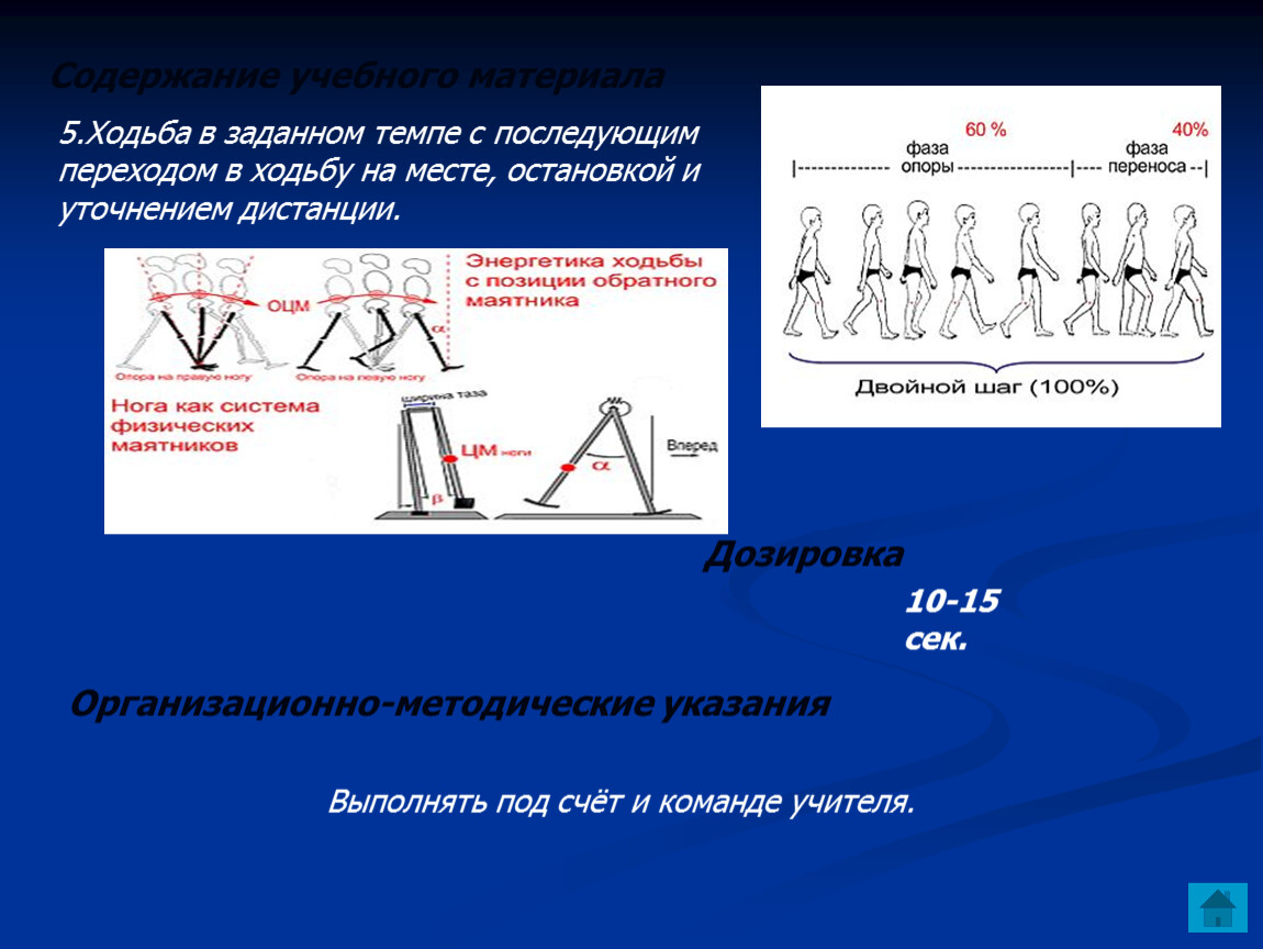 5.Ходьба в заданном темпе с последующим переходом в ходьбу на месте, остановкой и уточнением дистанции.