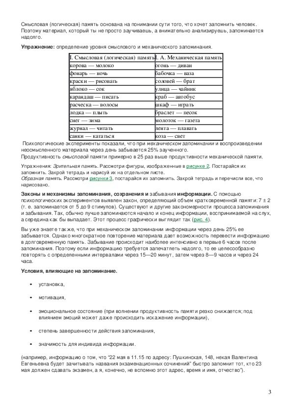 Память бывает также механической и смысловой. Механическая память — кратковременная. Уже