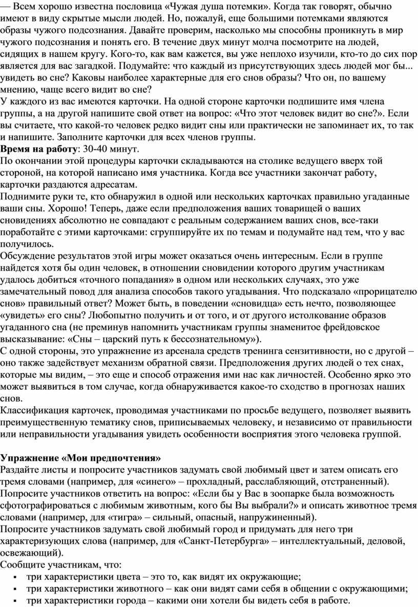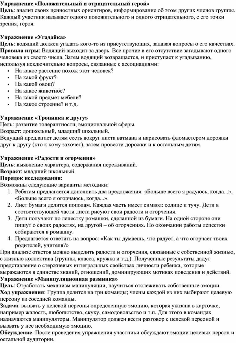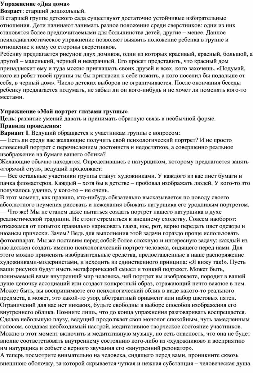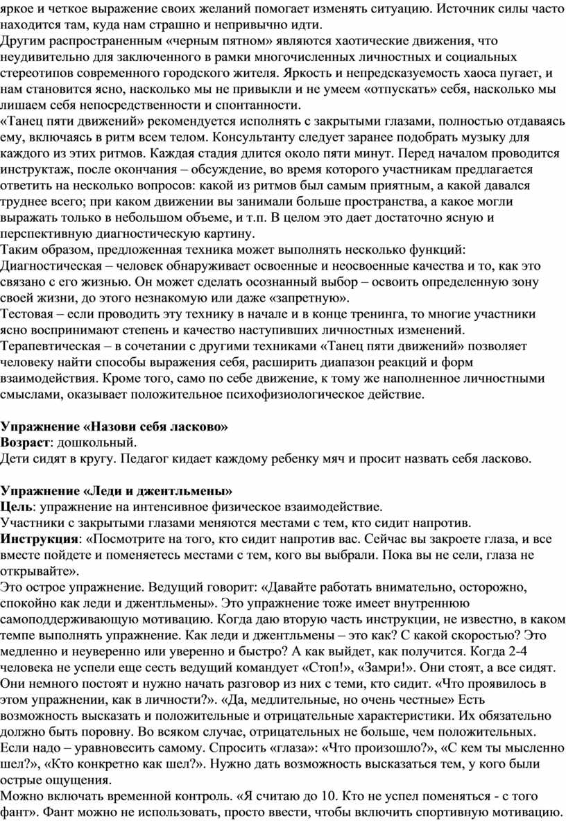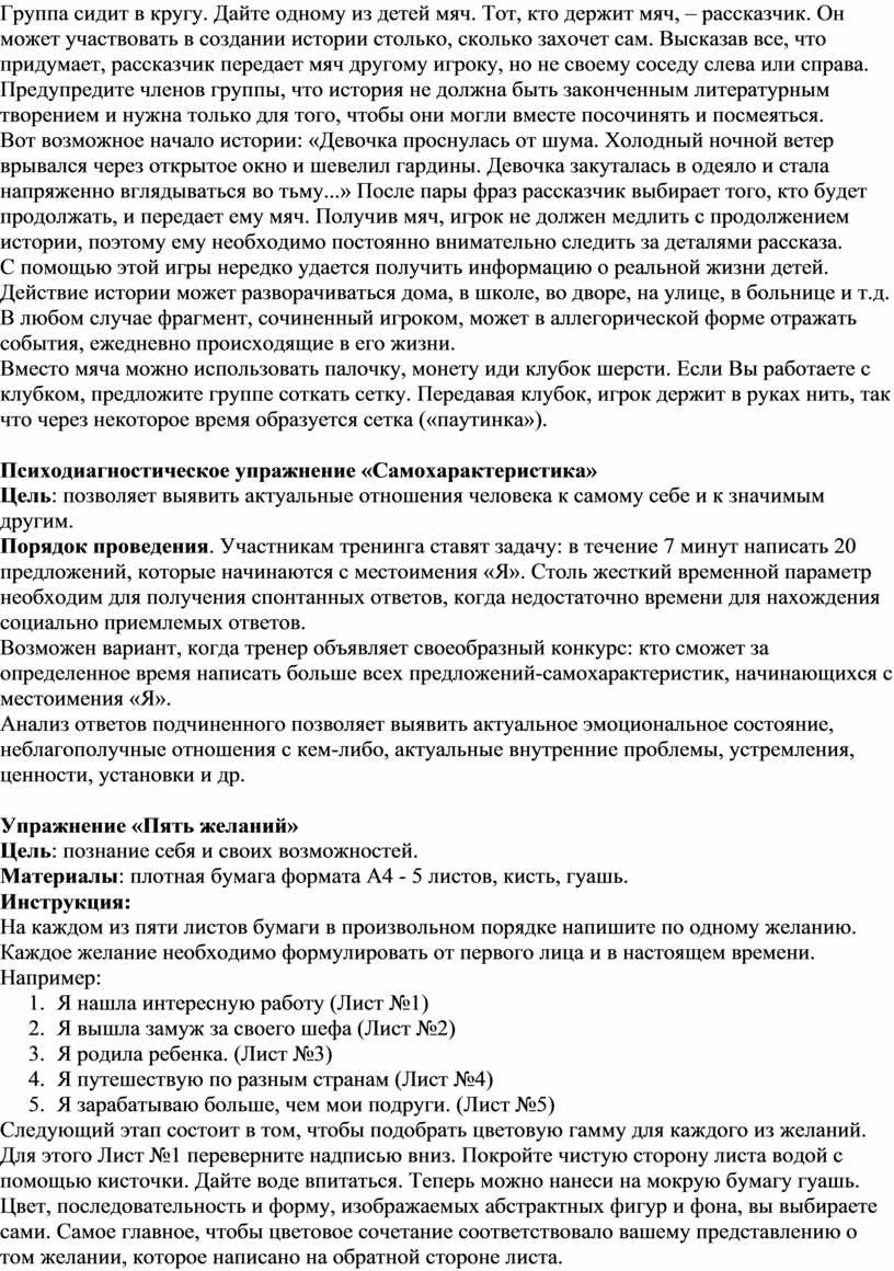 Игровое упражнение проводится в круге (число участников от 7 – 10 до 15 человек). Время – от 20 минут. Процедура методики следующая: