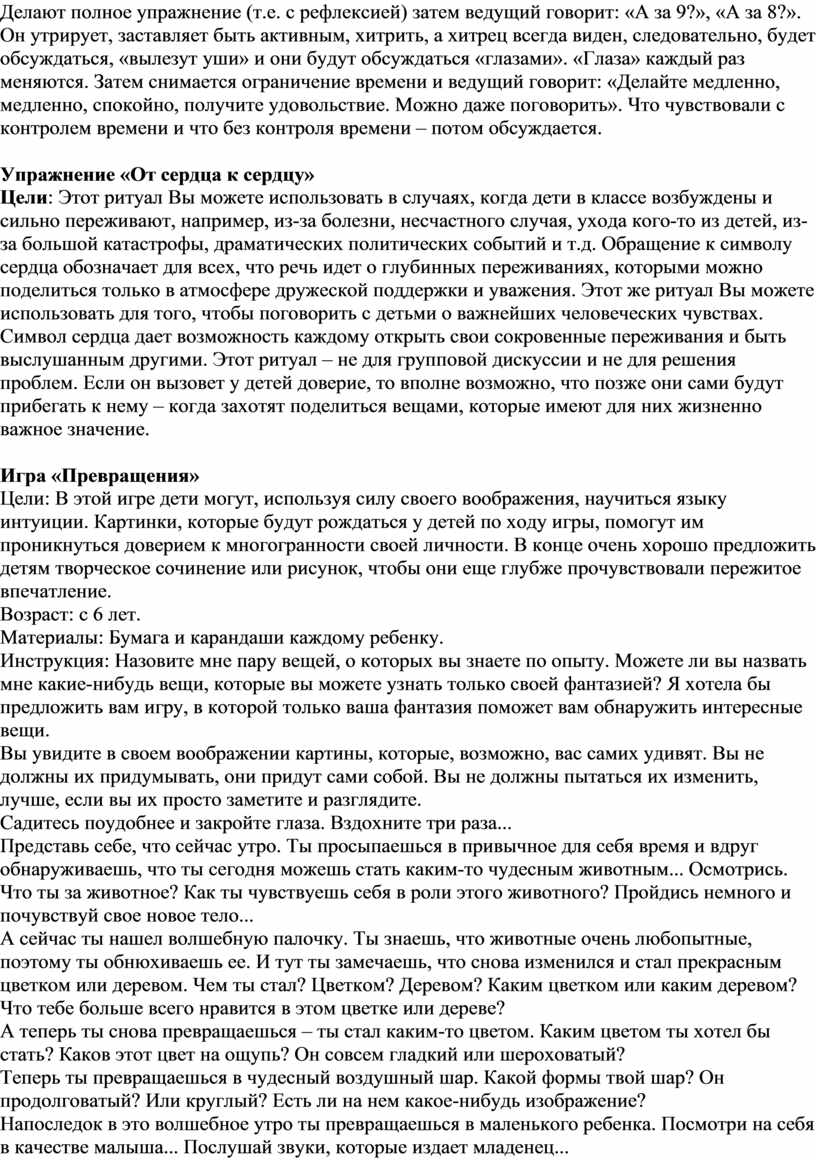 Возможные пути усложнения игры: убыстрение темпа; изменение направления расчета участников; расчет нечетными цифрами или буквами. Игра превращается, когда в кругу остается 2-3 участника. Это задание прежде всего на собирание внимания. Невозможно выполнить все требования игры, не сосредоточившись на ее условиях, на ситуации «здесь и теперь». Кроме того, это задание – на умение ориентироваться в окружающих условиях (выбывшие игроки) в ситуации ограниченного времени (заданный темп) и, наконец, это задание – на установление контакта между членами группы. Наблюдая за выполнением упражнения, можно выделить лидеров группы, пары, «отверженных». Интересно также проследить за интонациями, с которыми называются номера.
