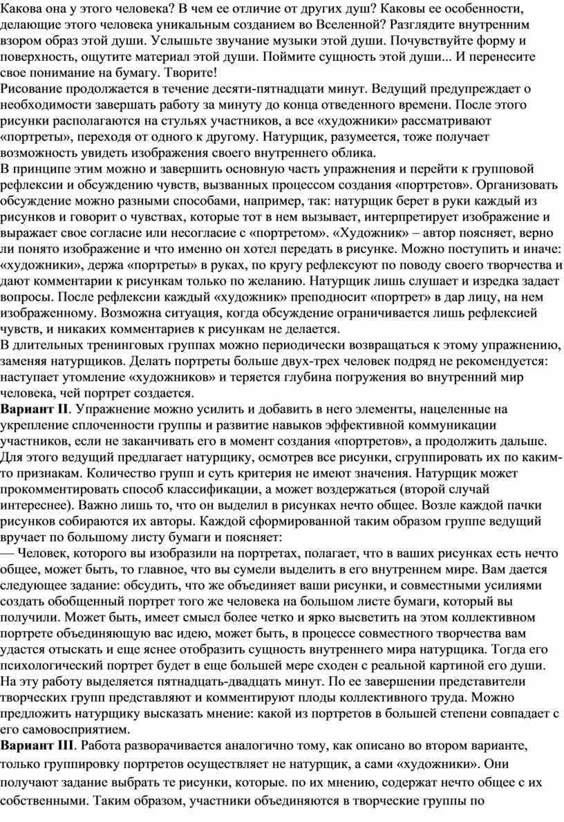 Когда рисунки выполнены, ведущий их собирает и перетасовывает в случайном порядке. Ведущий берет из стопки один рисунок и демонстрируя его группе, просит каждого участника поделиться впечатлениями, что за человек мог его нарисовать. Чей-то комментарий ограничивается одним словом, кто-то делится более подробными догадками. Это не самое важное. Главное – способствовать тому, чтобы высказались все, включая и авторов рисунков. Автору предлагается высказаться, что называется, для маскировки. (Чтобы избежать ослабления интереса и дежурных, поверхностных реплик просмотр рисунков прерывается).
