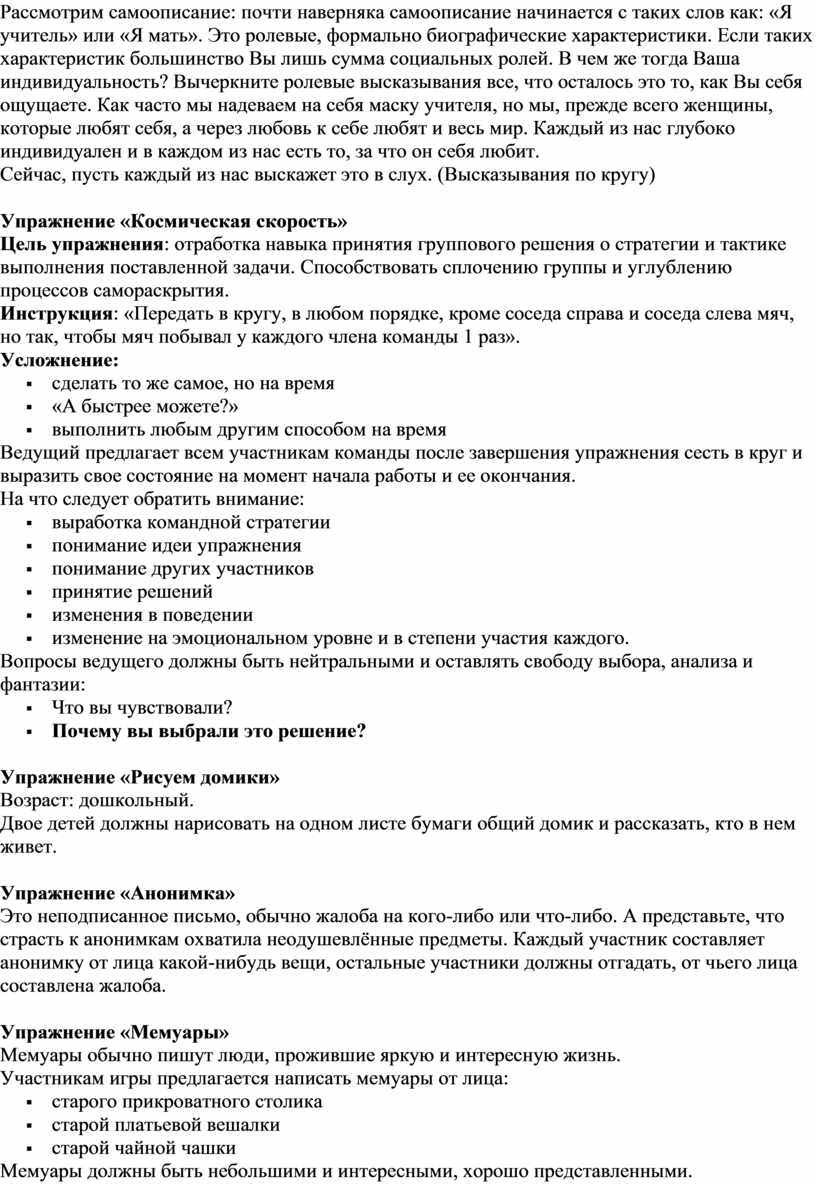 Рассмотрим самоописание: почти наверняка самоописание начинается с таких слов как: «Я учитель» или «Я мать». Это ролевые, формально биографические характеристики. Если таких характеристик большинство Вы лишь сумма социальных ролей. В чем же тогда Ваша индивидуальность? Вычеркните ролевые высказывания все, что осталось это то, как Вы себя ощущаете. Как часто мы надеваем на себя маску учителя, но мы, прежде всего женщины, которые любят себя, а через любовь к себе любят и весь мир. Каждый из нас глубоко индивидуален и в каждом из нас есть то, за что он себя любит.