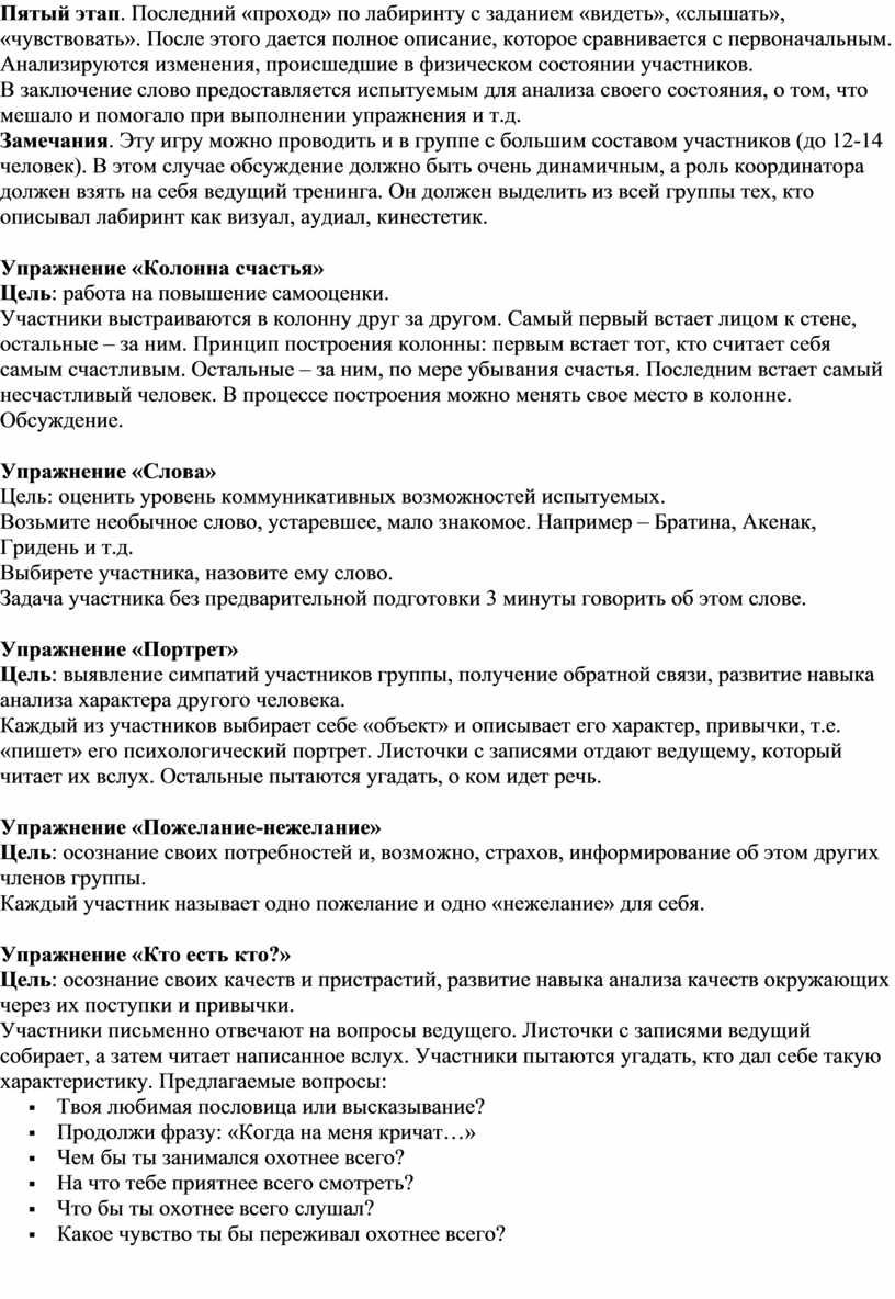 Цель упражнения: отработка навыка принятия группового решения о стратегии и тактике выполнения поставленной задачи. Способствовать сплочению группы и углублению процессов самораскрытия.