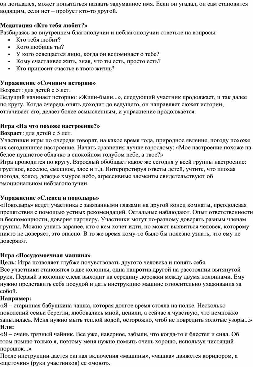 Дети, сидя в кругу, передают клубок ниток. Передача клубка сопровождается высказываниями о том, что тот, кто держит клубок, чувствует, что хочет для себя и что может пожелать другим. При затруднении психолог помогает ребенку – бросает клубок ему еще раз. Этот прием диагностичен: можно увидеть детей, испытывающих трудности в общении, – у ведущего с ними будут двойные, тройные связи. Когда клубок вернется к ведущему, дети натягивают нить и закрывают глаза, представляя, что они составляют одно целое, что каждый из них важен и значим в этом целом.