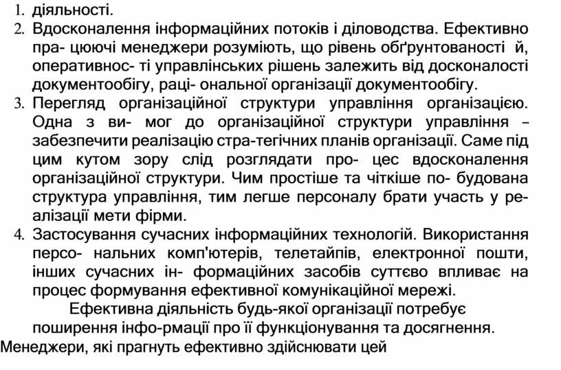 2. Вдосконалення інформаційних потоків і діловодства. Ефективно пра- цюючі менеджери розуміють, що рівень обґрунтованості й, оперативнос- ті управлінських рішень залежить від досконалості документообігу, раці- ональної організації документообігу.