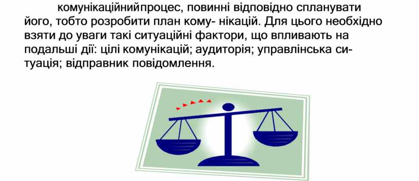 Менеджери, які прагнуть ефективно здійснювати цей комунікаційний процес, повинні відповідно спланувати його, тобто розробити план кому- нікацій. Для цього необхідно взяти до уваги такі ситуаційні фактори, що впливають на подальші дії: цілі комунікацій; аудиторія; управлінська си- туація; відправник повідомлення.