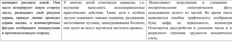 У многих детей отмечается апраксия, т.е. неумение выполнять целенаправленные практические действия. Такие дети с особым трудом осваивают навыки одевания, раздевания, застегивания пуговиц, зашнуровывания ботинок; они долго не могут научиться застилать кровать. |