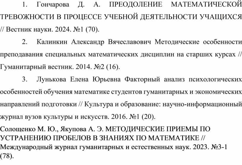 1. Гончарова Д. А. ПРЕОДОЛЕНИЕ МАТЕМАТИЧЕСКОЙ ТРЕВОЖНОСТИ В ПРОЦЕССЕ УЧЕБНОЙ ДЕЯТЕЛЬНОСТИ УЧАЩИХСЯ // Вестник науки. 2024. №1 (70).