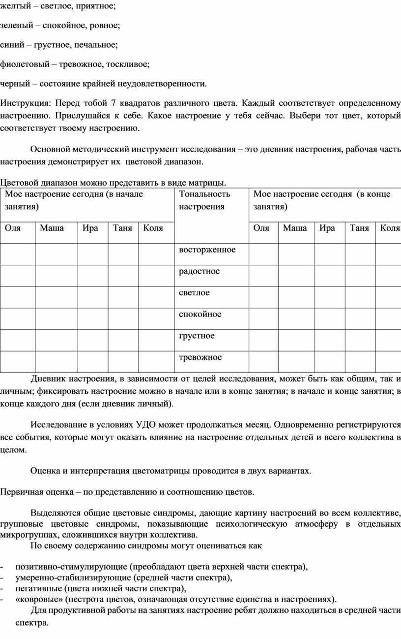 Основной методический инструмент исследования – это дневник настроения, рабочая часть настроения демонстрирует их цветовой диапазон.