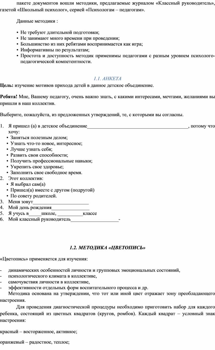 В данном пакете документов «В помощь педагогу ДО» мы предлагаем материал, который может использовать педагог в своей работе по изучению разных сторон личности учащихся. В пакете документов вошли методики, предлагаемые журналом «Классный руководитель», газетой «Школьный психолог», серией «Психологам – педагогам».