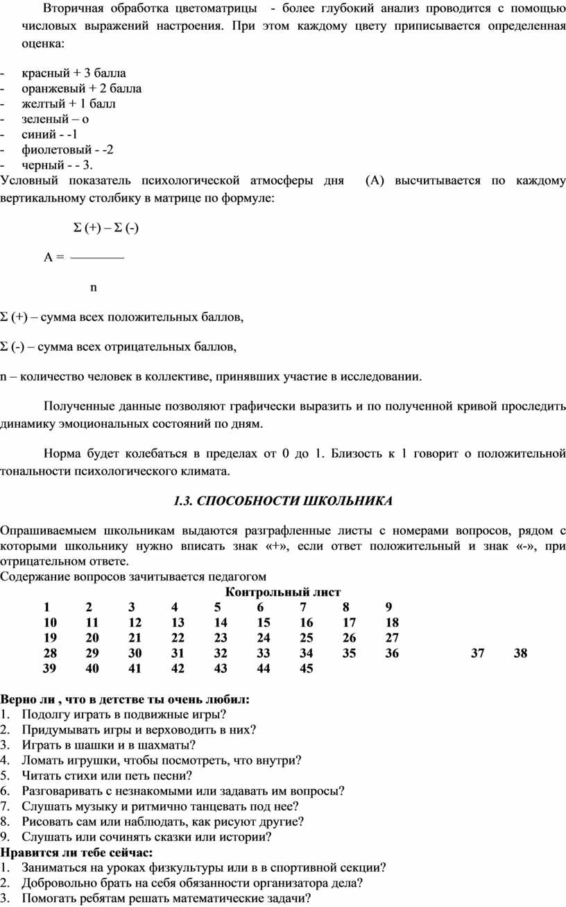 Выделяются общие цветовые синдромы, дающие картину настроений во всем коллективе, групповые цветовые синдромы, показывающие психологическую атмосферу в отдельных микрогруппах, сложившихся внутри коллектива.