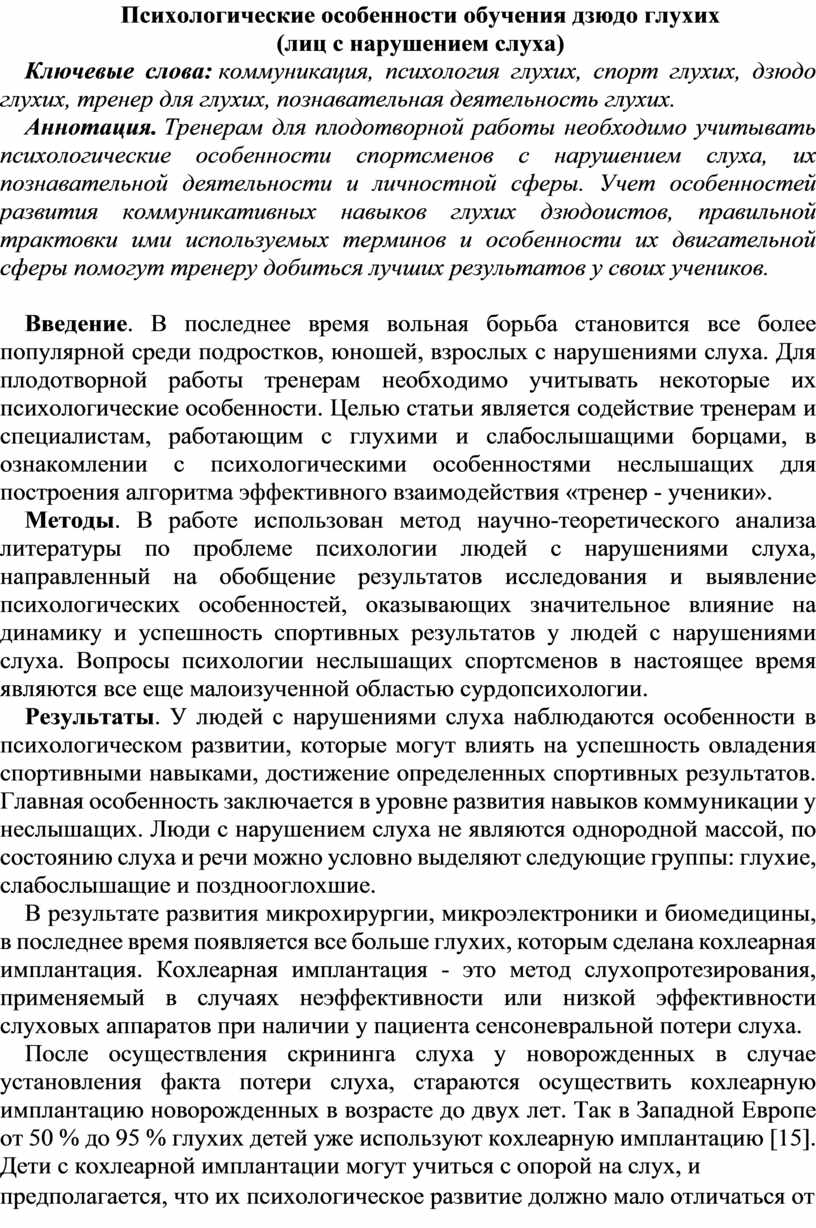 Методы. В работе использован метод научно-теоретического анализа литературы по проблеме психологии людей с нарушениями слуха, направленный на обобщение результатов исследования и выявление психологических особенностей, оказывающих значительное влияние на динамику и успешность спортивных результатов у людей с нарушениями слуха. Вопросы психологии неслышащих спортсменов в настоящее время являются все еще малоизученной областью сурдопсихологии.