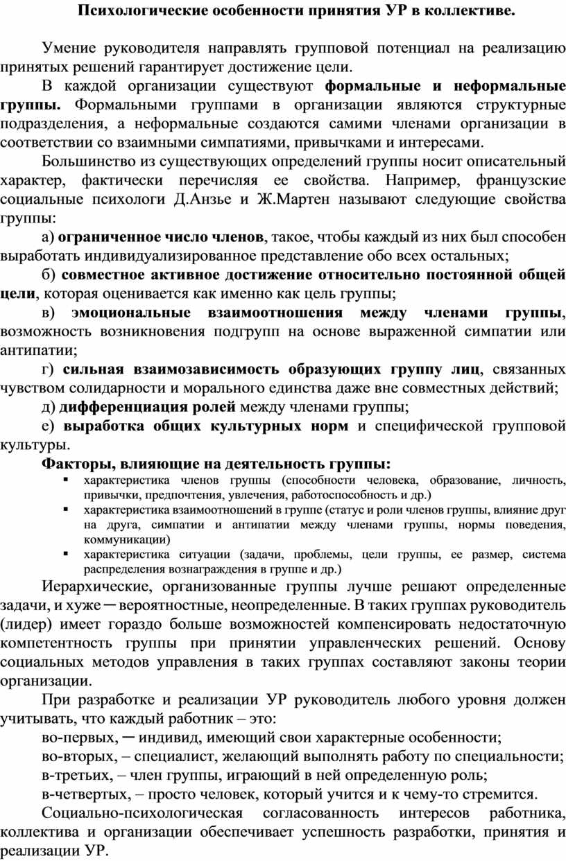 Социально-психологическая согласованность интересов работника, коллектива и организации обеспечивает успешность разработки, принятия и реализации УР.