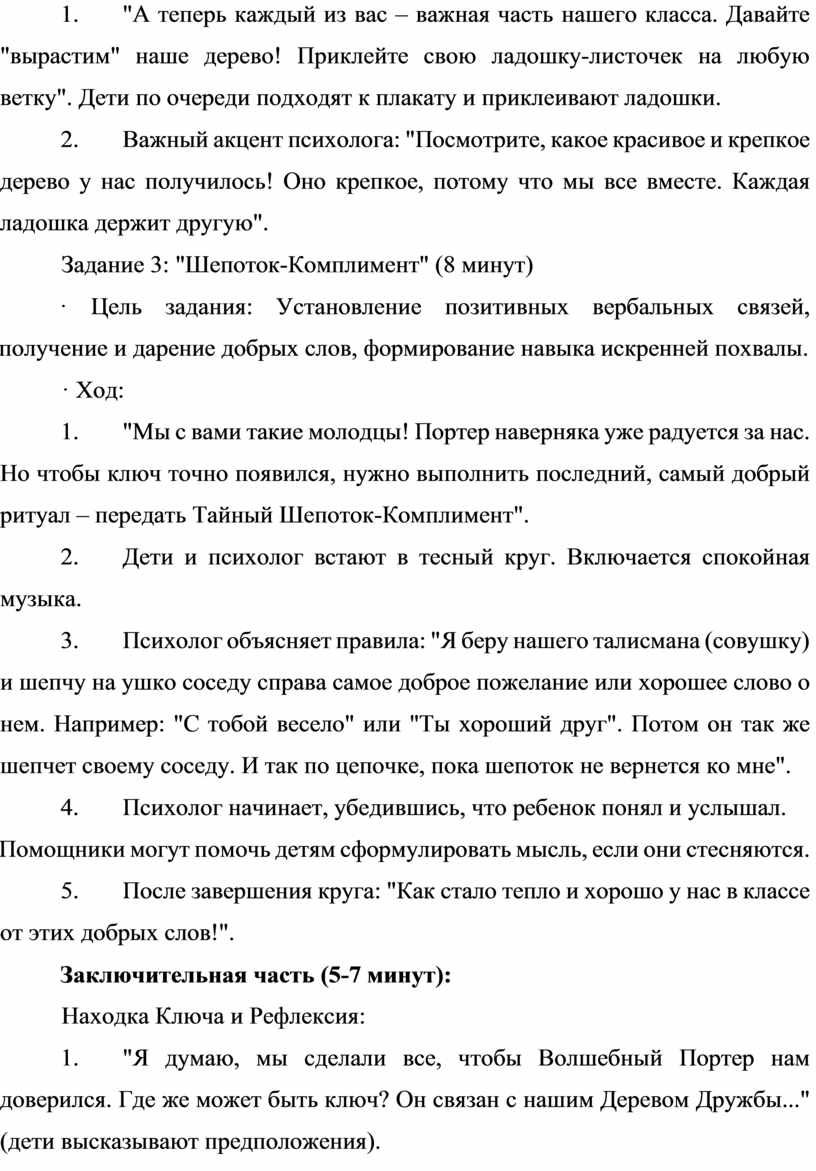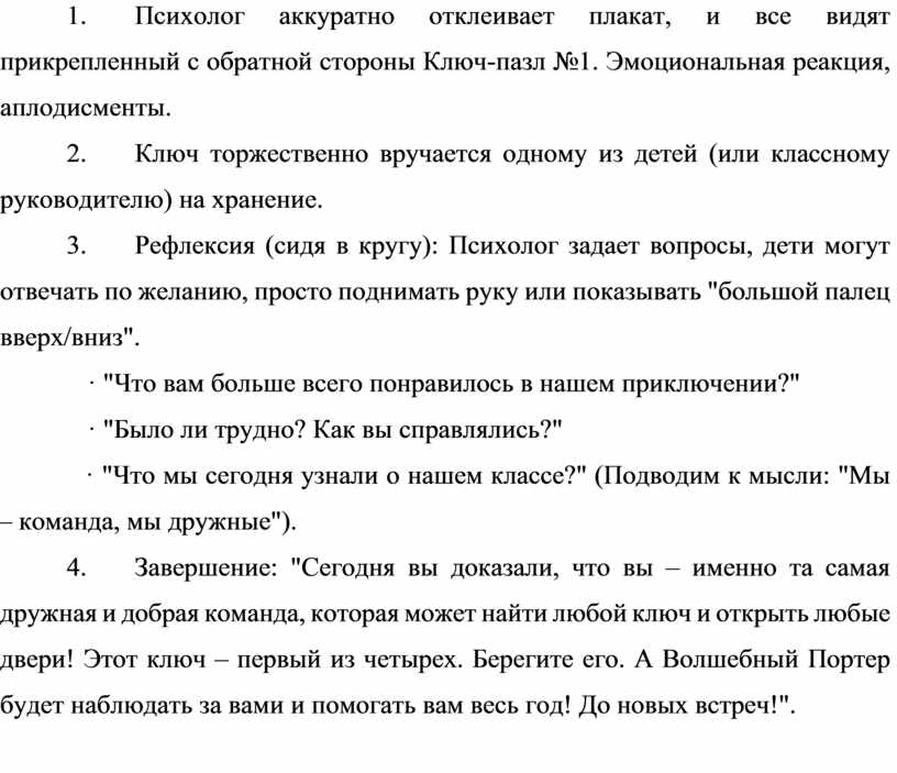 5. Завершение: "Сегодня вы доказали, что вы – именно та самая дружная и добрая команда, которая может найти любой ключ и открыть любые двери! Этот ключ – первый из четырех. Берегите его. А Волшебный Портер будет наблюдать за вами и помогать вам весь год! До новых встреч!".