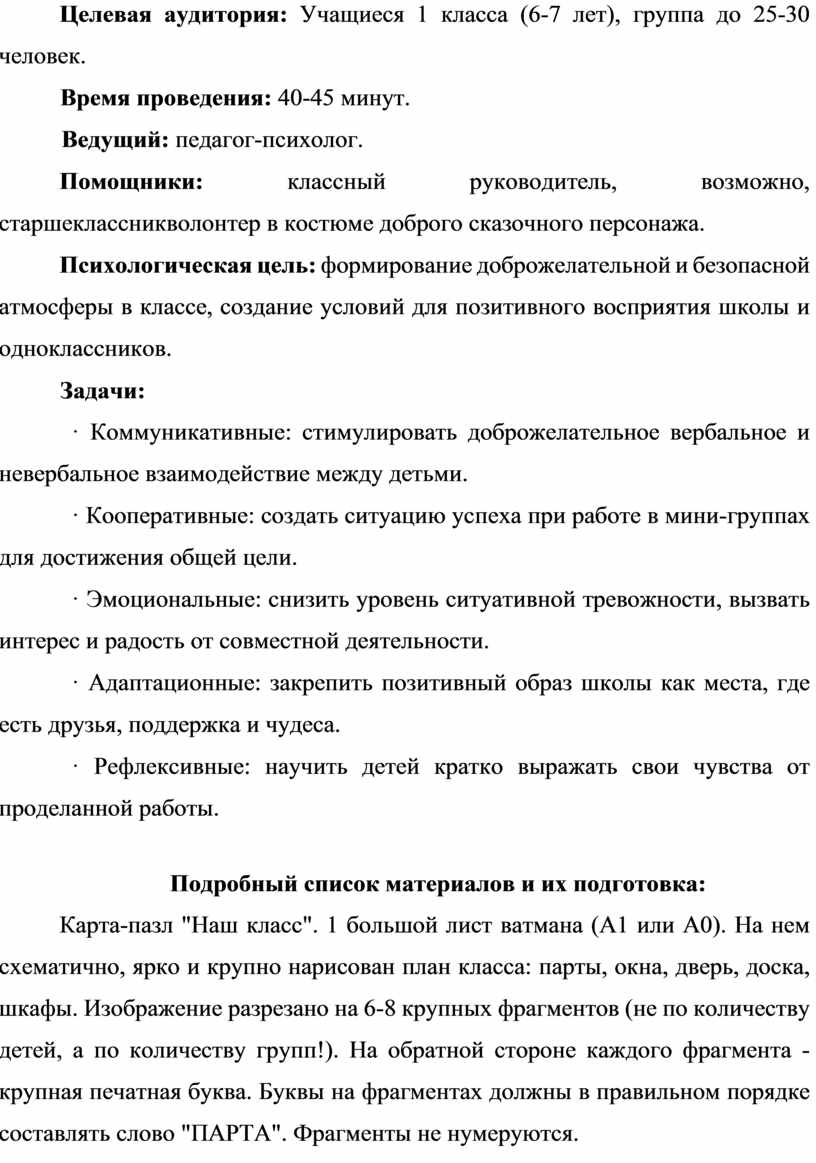 Психологическая цель: формирование доброжелательной и безопасной атмосферы в классе, создание условий для позитивного восприятия школы и одноклассников.