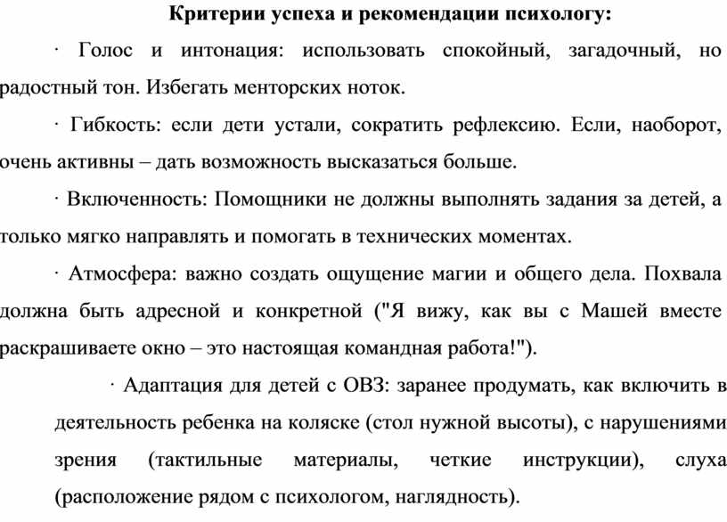 Критерии успеха и рекомендации психологу: