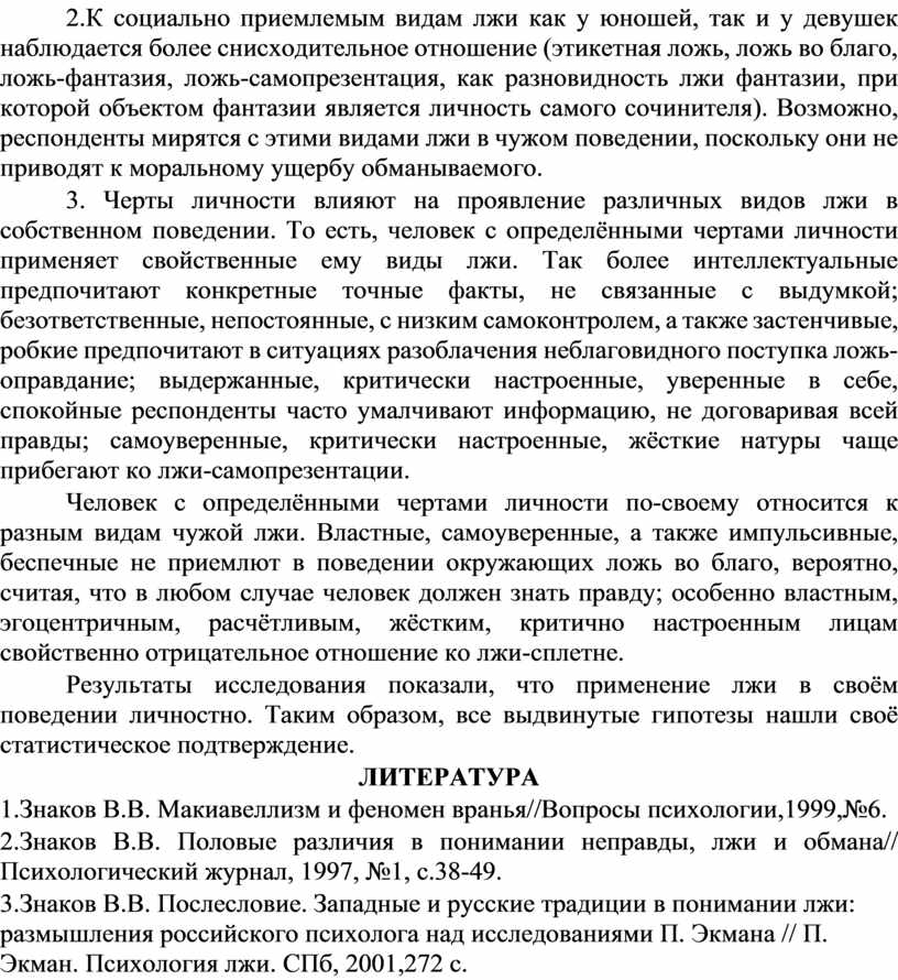 3.Знаков В.В. Послесловие. Западные и русские традиции в понимании лжи: размышления российского психолога над исследованиями П. Экмана // П. Экман. Психология лжи. СПб, 2001,272 с.
