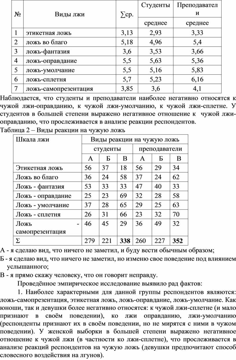 Гипотезы исследования:1. Студенты и преподаватели различаются по частоте применения ими различных видов лжи в межличностном общении и по реакциям на проявления лжи в чужом поведении.