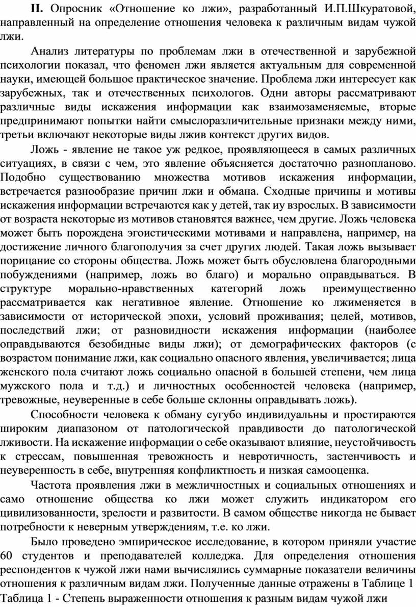 II. Опросник «Отношение ко лжи», разработанный И.П.Шкуратовой, направленный на определение отношения человека к различным видам чужой лжи.