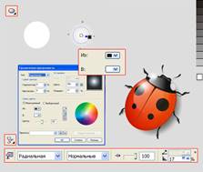 1. Круг (с нажатой <Ctrl>). Интерактивная заливка, Радиальная, Цвета: по листу (пипеткой) от темного к светлому и белому.