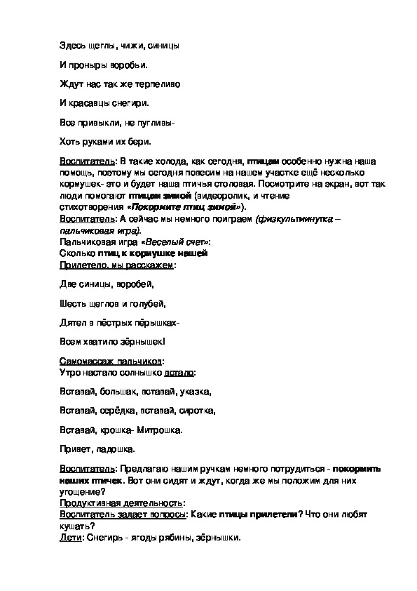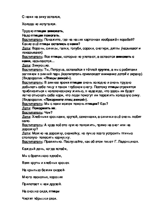 Воспитатель: В зимнее время птицам очень холодно и очень трудно добывать себе пищу в таком глубоком снегу. Поэтому птицы стремятся приблизиться к человеческому жилью, в надежде, что здесь им будет легче отыскать себе корм, что люди помогут им пережить холодную зиму. (Видеоролик «Покормите птиц зимой»).