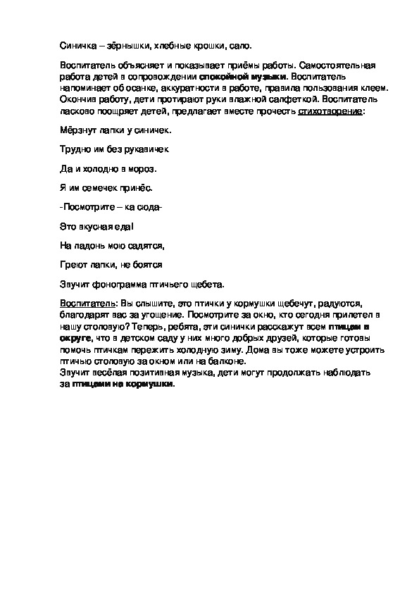 Предварительная работа: наблюдение, рассматривание иллюстраций; чтение стихов, художественных произведений; заучивание стихотворения Г. Ладонщикова «Мёрзнут лапки у синичек…»; поделка кормушек совместно с родителями; кормление птиц; подготовка материала для аппликации.
