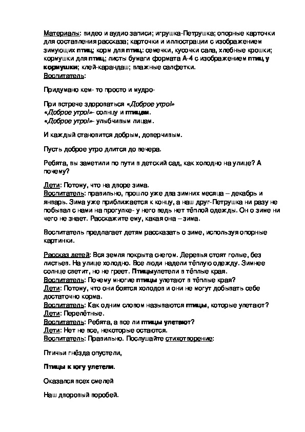 Материалы: видео и аудио записи; игрушка-Петрушка; опорные карточки для составления рассказа; карточки и иллюстрации с изображением зимующих птиц; корм для птиц: семечки, кусочки сала, хлебные крошки; кормушки для птиц; листы бумаги формата А-4 с изображением птиц у кормушки; клей-карандаш; влажные салфетки.