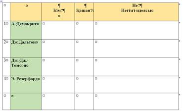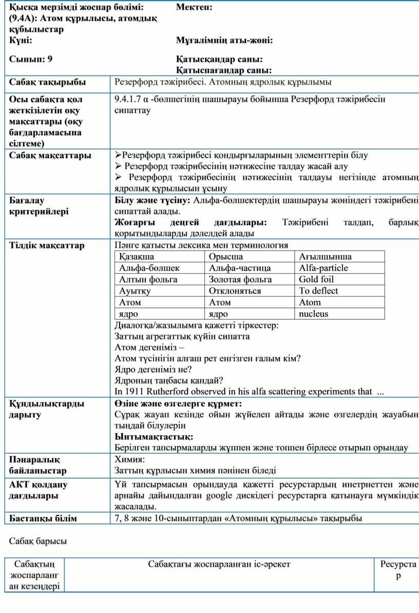 Барлық оқушылар: Ø Атомның ядролық құрылысын дәлелдейтін альфа-бөлшектердің шашырауы жөніндегі тәжірибені сипаттай алады; Оқушылардың көпшілігі: Ø Резерфорд тәжірибесінің нәтижесінің талдауы негізінде атомның ядролық құрылысын ұсына алады; Кейбір оқушылар: Ø Резерфорд тәжірибесінің нәтижесіне талдау жасай алады; |