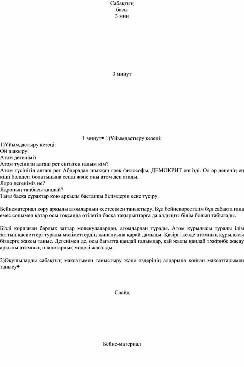 1)Ұйымдастыру кезеңі: Ой шақыру: Атом дегеніміз – Атом түсінігін алғаш рет енгізген ғалым кім? Атом түсінігін алғаш рет Абдерадан шыққан грек философы, ДЕМОКРИТ енгізді. Ол әр дененің ең кіші бөлшегі болатынына сенді және оны атом деп атады. Ядро дегеніміз не? Ядроның таңбасы қандай? Тағы басқа сұрақтар қою арқылы бастапқы білімдерін еске түсіру.