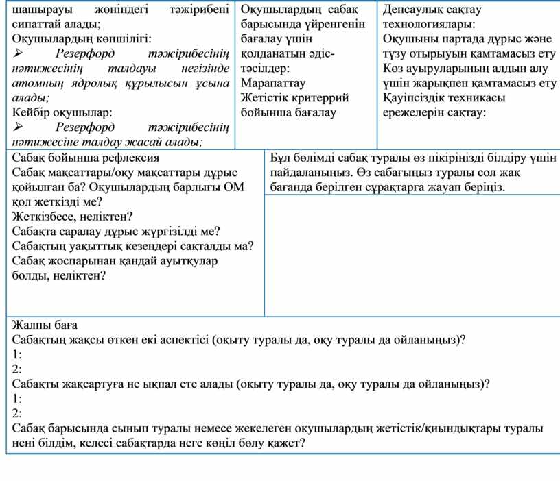 Сабақ бойынша рефлексия Сабақ мақсаттары/оқу мақсаттары дұрыс қойылған ба? Оқушылардың барлығы ОМ қол жеткізді ме? Жеткізбесе, неліктен? Сабақта саралау дұрыс жүргізілді ме? Сабақтың уақыттық кезеңдері сақталды ма? Сабақ жоспарынан қандай ауытқулар болды, неліктен? |
