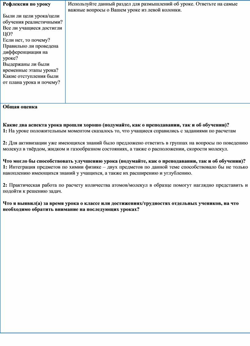 Что могло бы способствовать улучшению урока (подумайте, как о преподавании, так и об обучении)? 1: Интеграция предметов по химии физике – двух предметов по данной теме способствовало бы не только накоплению имеющихся знаний у учащихся, а также их расширению и углублению.