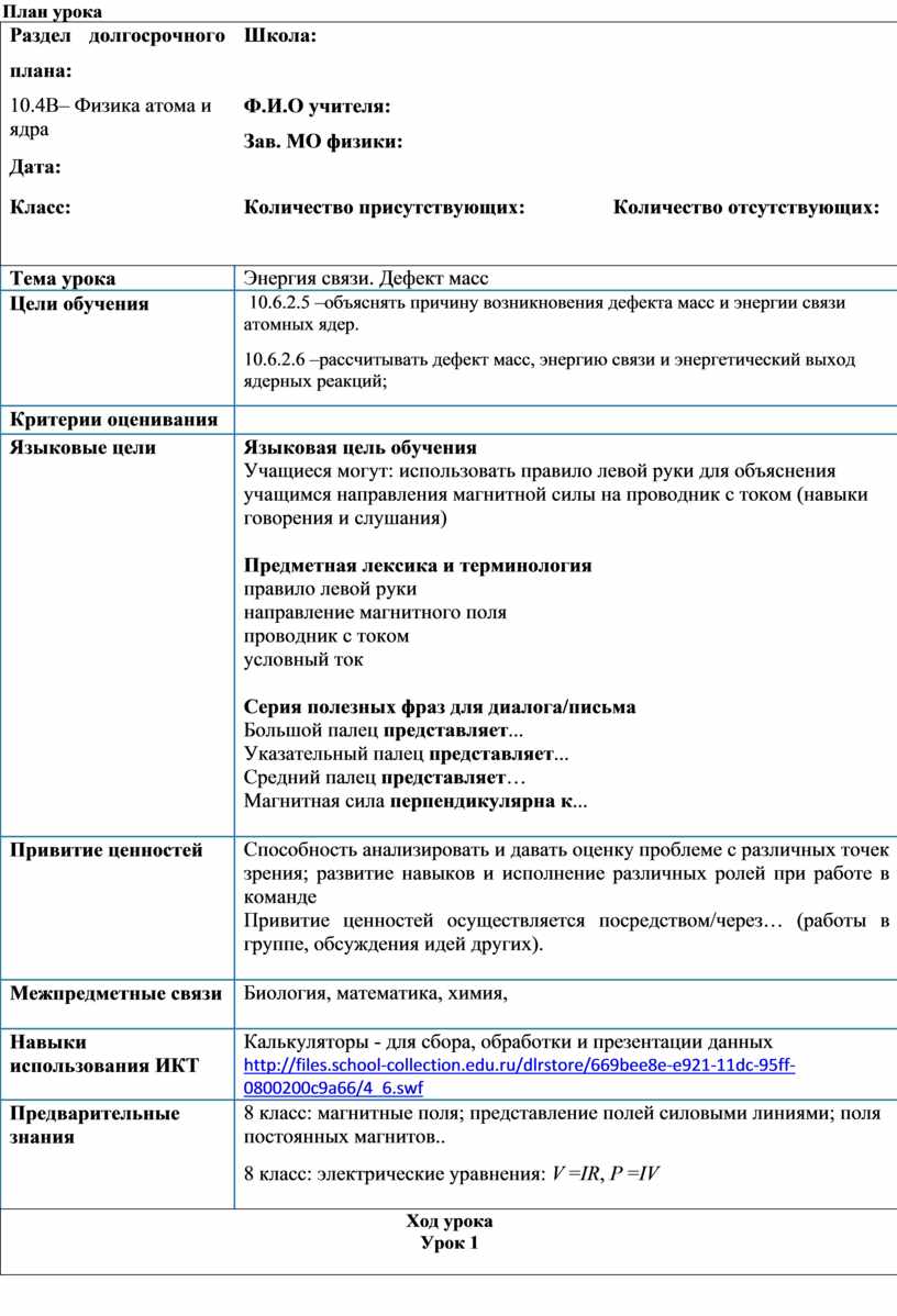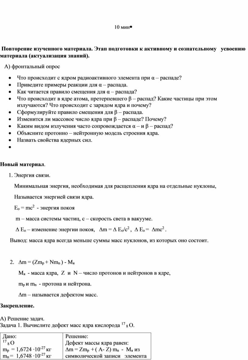 10.6.2.5 –объяснять причину возникновения дефекта масс и энергии связи атомных ядер. 10.6.2.6 –рассчитывать дефект масс, энергию связи и энергетический выход ядерных реакций; |
