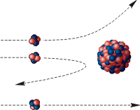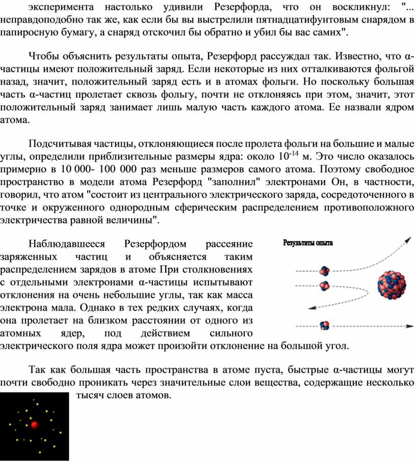 То, что некоторые α-частицы отскакивали от фольги назад, противоречило модели Томсона. Результаты эксперимента настолько удивили Резерфорда, что он воскликнул: "... неправдоподобно так же, как если бы вы выстрелили пятнадцатифунтовым снарядом в папиросную бумагу, а снаряд отскочил бы обратно и убил бы вас самих". Чтобы объяснить результаты опыта, Резерфорд рассуждал так. Известно, что α-частицы имеют положительный заряд. Если некоторые из них отталкиваются фольгой назад, значит, положительный заряд есть и в атомах фольги. Но поскольку бoльшая часть α-частиц пролетает сквозь фольгу, почти не отклоняясь при этом, значит, этот положительный заряд занимает лишь малую часть каждого атома. Ее назвали ядром атома.