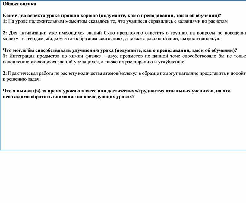 Что могло бы способствовать улучшению урока (подумайте, как о преподавании, так и об обучении)? 1: Интеграция предметов по химии физике – двух предметов по данной теме способствовало бы не только накоплению имеющихся знаний у учащихся, а также их расширению и углублению.