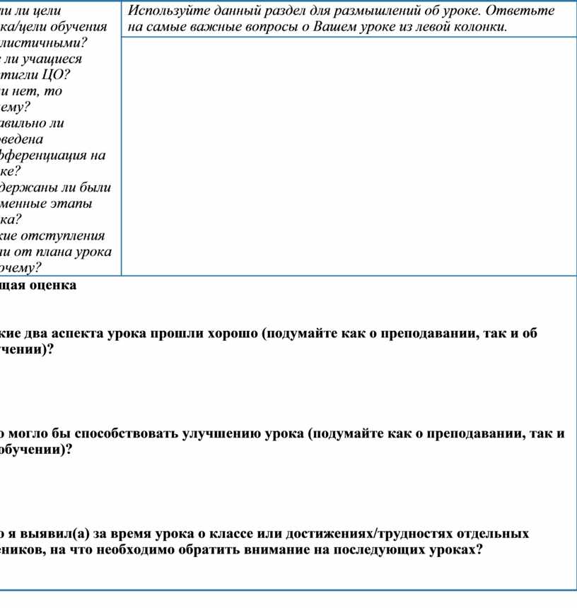 Используйте данный раздел для размышлений об уроке. Ответьте на самые важные вопросы о Вашем уроке из левой колонки. |