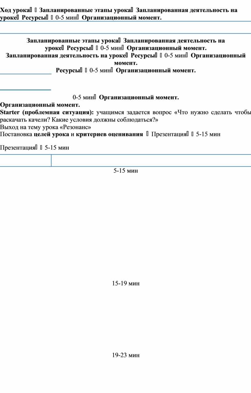 Организационный момент. Starter (проблемная ситуация): учащимся задается вопрос «Что нужно сделать чтобы раскачать качели? Какие условия должны соблюдаться?» Выход на тему урока «Резонанс» Постановка целей урока и критериев оценивания |