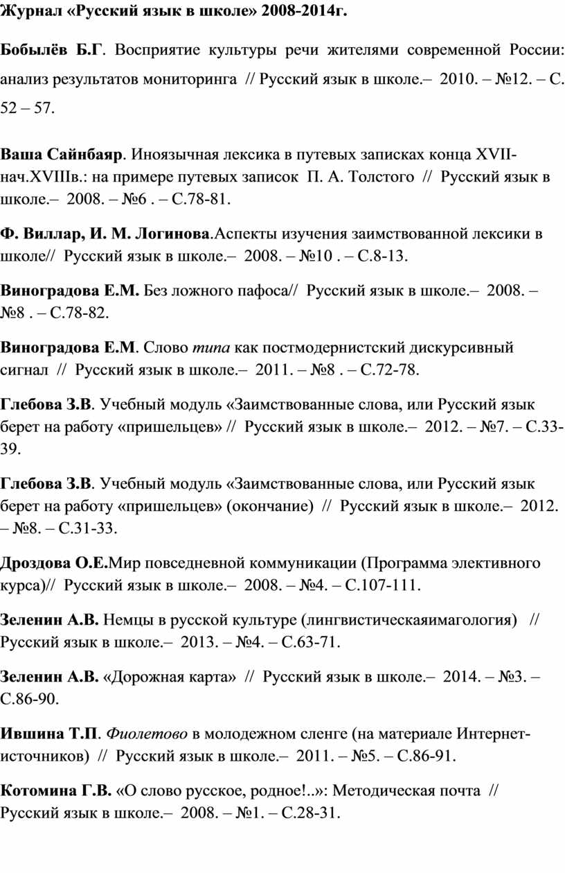 Остановимся подробно на некоторых статьях, касающихся заявленной темы. В статье «Аспекты изучения заимствованной лексики в школе» (Ф. Виллар, И.М. Логинова «Аспекты изучения заимствованной лексики в школе», «Русский язык в школе», 2008г., № 10) авторы заявляют, что «в наступившем 21 веке русский язык претерпевает в своем развитии ряд существенных изменений, одним из которых является обильное заимствование лексики, особенно из английского (американского) языка». Этот процесс, по мнению авторов, вызывает определенные трудности в обучении русскому языку в школе. Например, школьники не всегда понимают значение заимствованных слов из-за их неясной внутренней формы и морфологической структуры, стертой в процессе заимствования.
