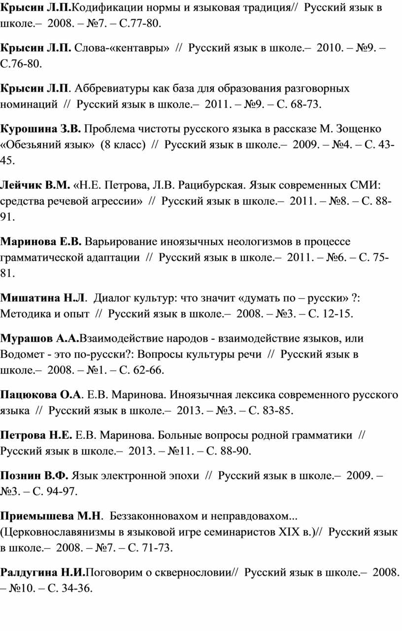 Крысин Л.П.Кодификации нормы и языковая традиция// Русский язык в школе.– 2008. – №7. – С.77-80.
