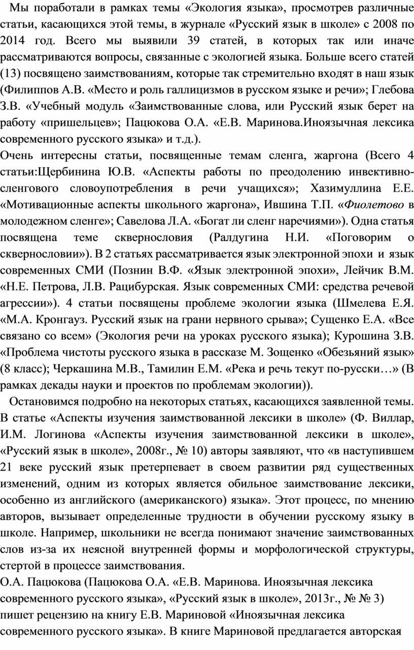 Мы поработали в рамках темы «Экология языка», просмотрев различные статьи, касающихся этой темы, в журнале «Русский язык в школе» с 2008 по 2014 год. Всего мы выявили 39 статей, в которых так или иначе рассматриваются вопросы, связанные с экологией языка. Больше всего статей (13) посвящено заимствованиям, которые так стремительно входят в наш язык (Филиппов А.В. «Место и роль галлицизмов в русском языке и речи»; Глебова З.В. «Учебный модуль «Заимствованные слова, или Русский язык берет на работу «пришельцев»; Пацюкова О.А. «Е.В. Маринова.Иноязычная лексика современного русского языка» и т.д.).