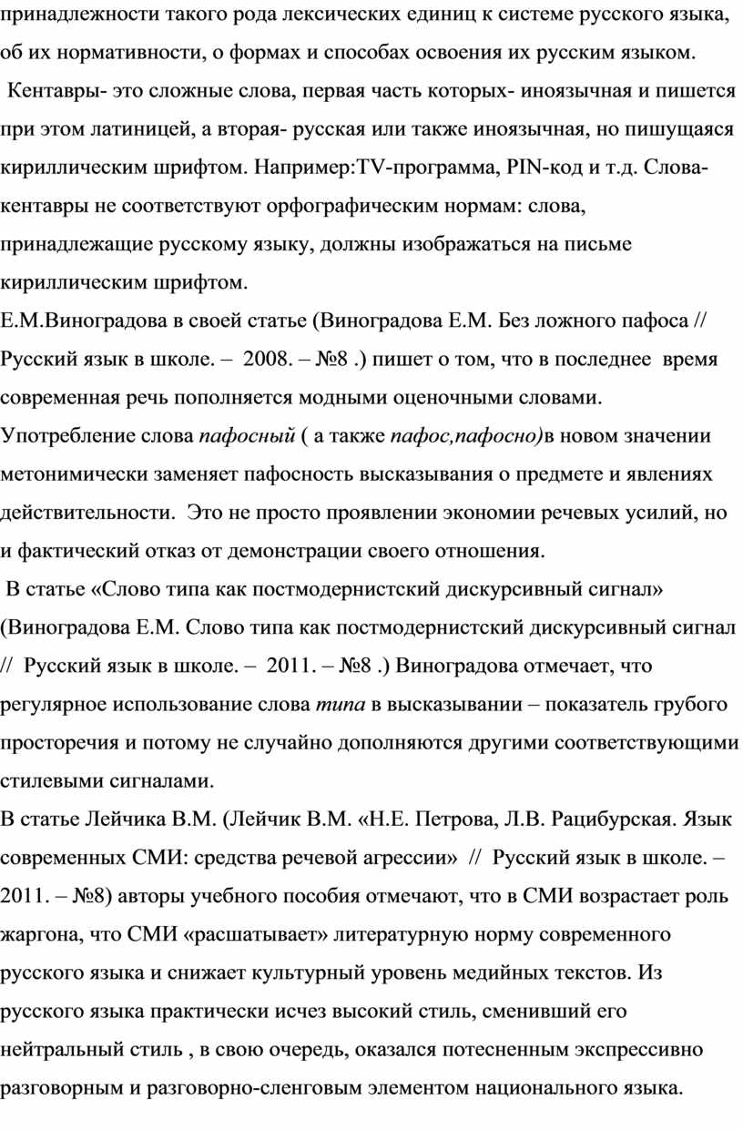В статье Лейчика В.М. (Лейчик В.М. «Н.Е. Петрова, Л.В. Рацибурская. Язык современных СМИ: средства речевой агрессии» // Русский язык в школе. – 2011. – №8) авторы учебного пособия отмечают, что в СМИ возрастает роль жаргона, что СМИ «расшатывает» литературную норму современного русского языка и снижает культурный уровень медийных текстов. Из русского языка практически исчез высокий стиль, сменивший его нейтральный стиль , в свою очередь, оказался потесненным экспрессивно разговорным и разговорно-сленговым элементом национального языка.
