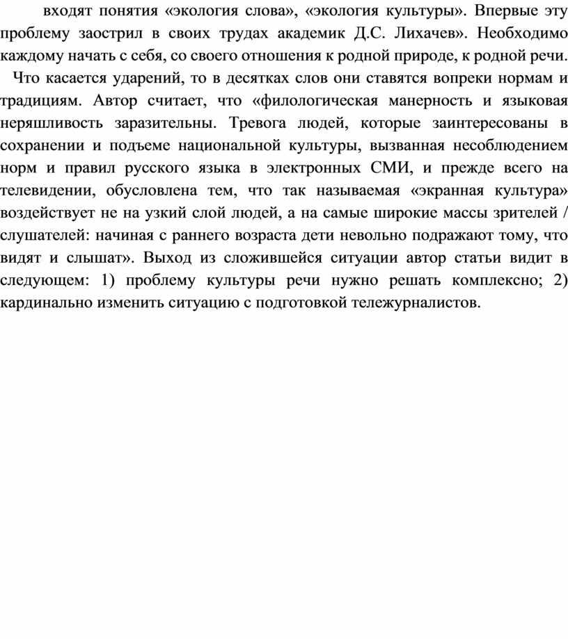 Что касается ударений, то в десятках слов они ставятся вопреки нормам и традициям. Автор считает, что «филологическая манерность и языковая неряшливость заразительны. Тревога людей, которые заинтересованы в сохранении и подъеме национальной культуры, вызванная несоблюдением норм и правил русского языка в электронных СМИ, и прежде всего на телевидении, обусловлена тем, что так называемая «экранная культура» воздействует не на узкий слой людей, а на самые широкие массы зрителей / слушателей: начиная с раннего возраста дети невольно подражают тому, что видят и слышат». Выход из сложившейся ситуации автор статьи видит в следующем: 1) проблему культуры речи нужно решать комплексно; 2) кардинально изменить ситуацию с подготовкой тележурналистов.