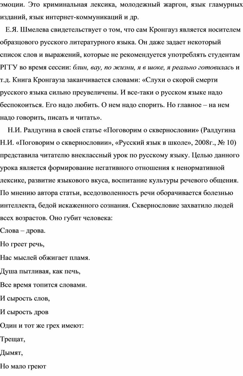 Н.И. Ралдугина в своей статье «Поговорим о сквернословии» (Ралдугина Н.И. «Поговорим о сквернословии», «Русский язык в школе», 2008г., № 10) представила читателю внеклассный урок по русскому языку. Целью данного урока является формирование негативного отношения к ненормативной лексике, развитие языкового вкуса, воспитание культуры речевого общения. По мнению автора статьи, вседозволенность речи оборачивается болезнью интеллекта, бедой искаженного сознания. Сквернословие захватило людей всех возрастов. Оно губит человека: